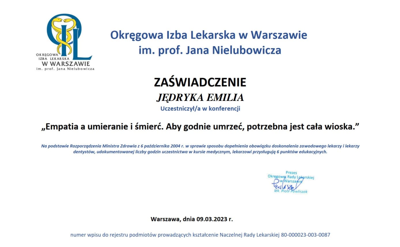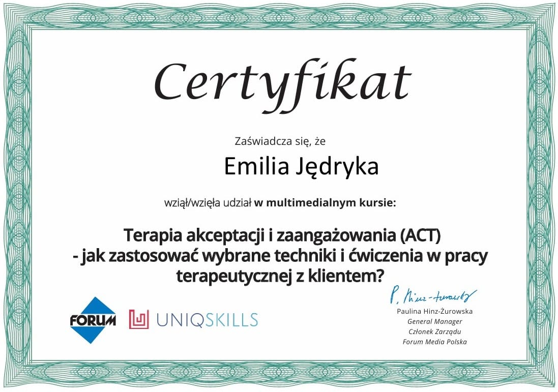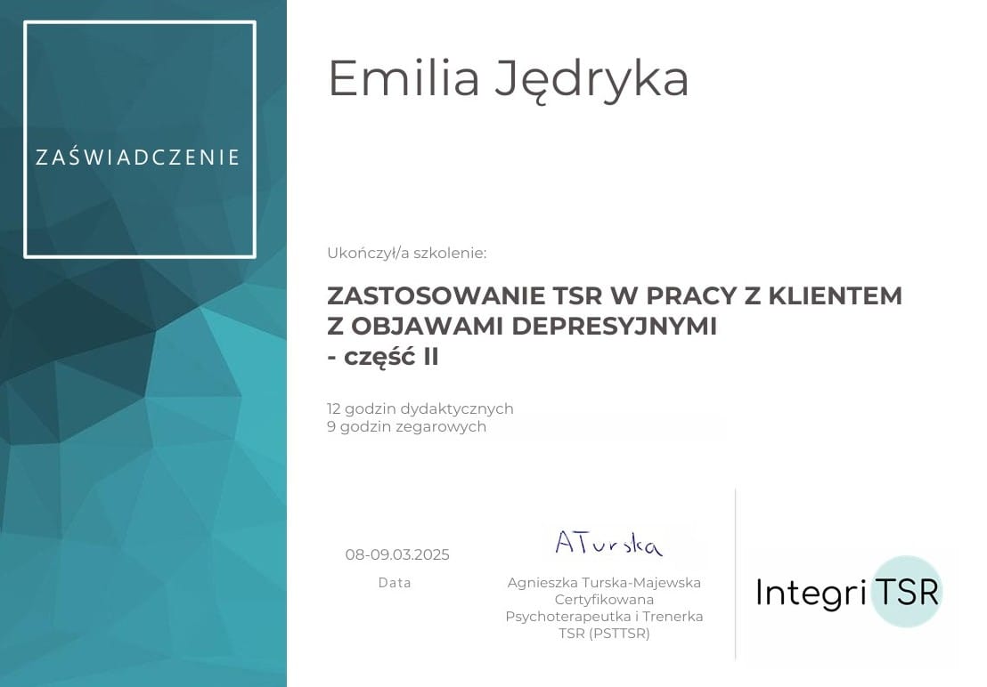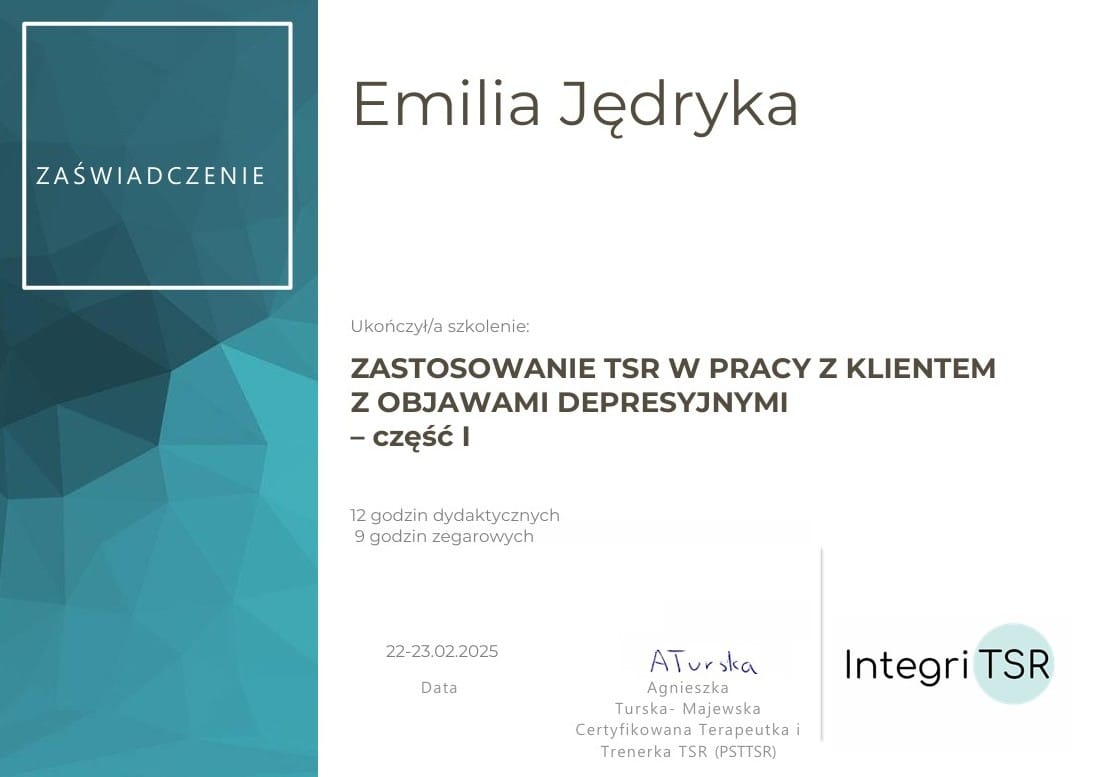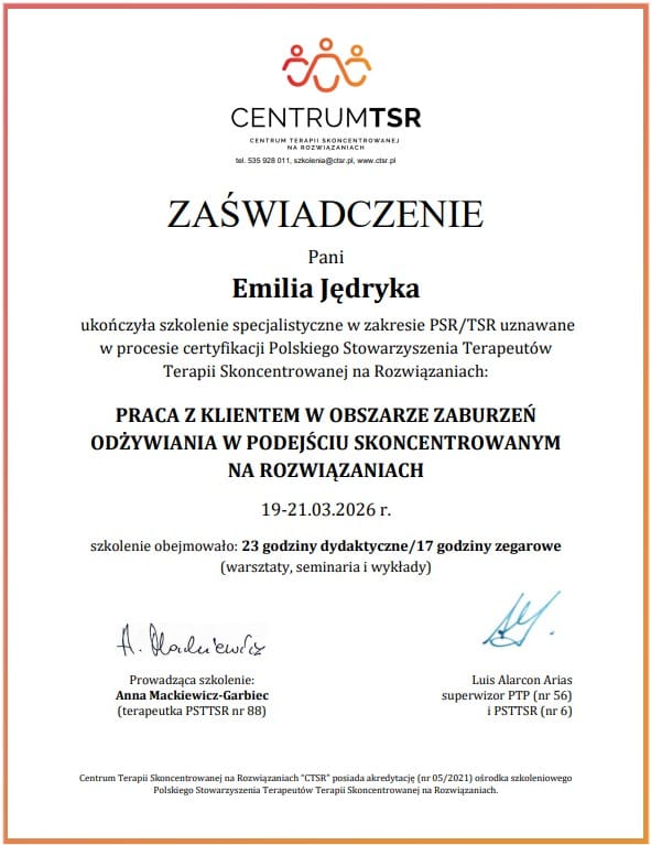 Ukończyłam szkolenie stopnia podstawowego oraz zaawansowanego Terapii Skoncentrowanej na Rozwiązaniach w ośrodku szkoleniowym akredytowanym przez PSTTSR.