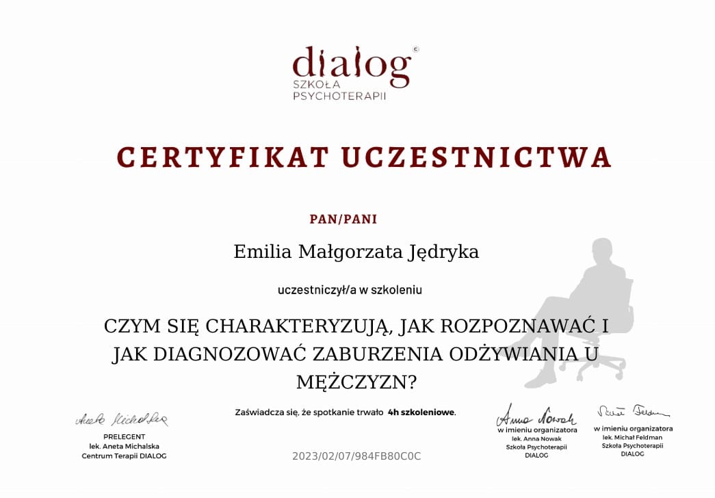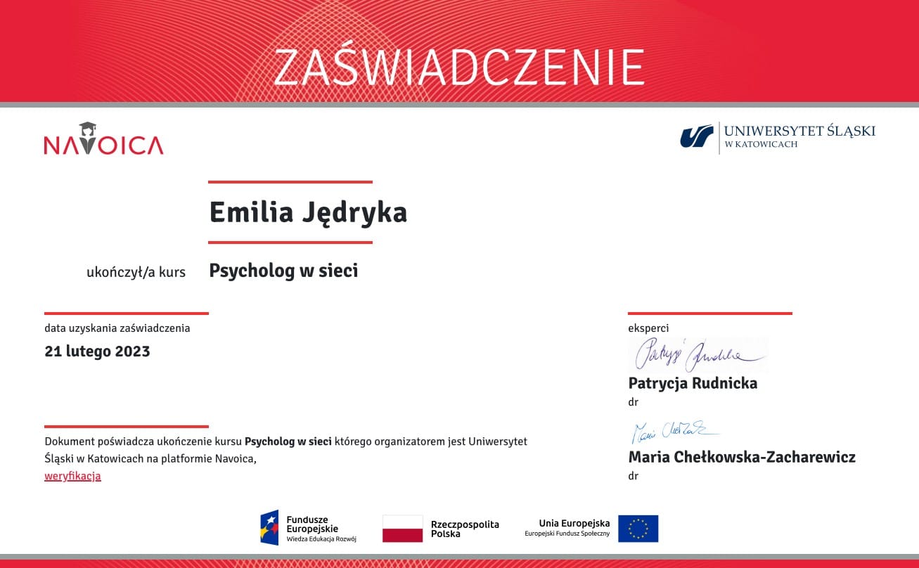 Jestem absolwentką jednolitych magisterskich studiów psychologicznych ze specjalnością kliniczną ukończonych w Krakowie.