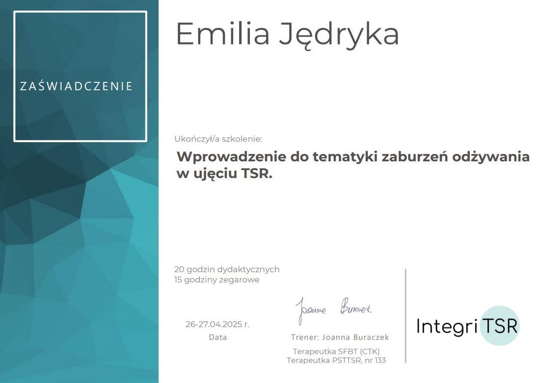 Dążę do stałego rozwoju, podążając ścieżką certyfikacji Terapeuty TSR oraz studiów podyplomowych z zakresu psychodietetyki.